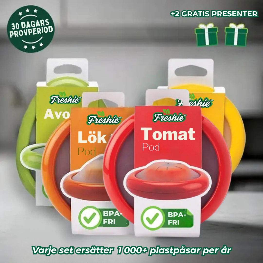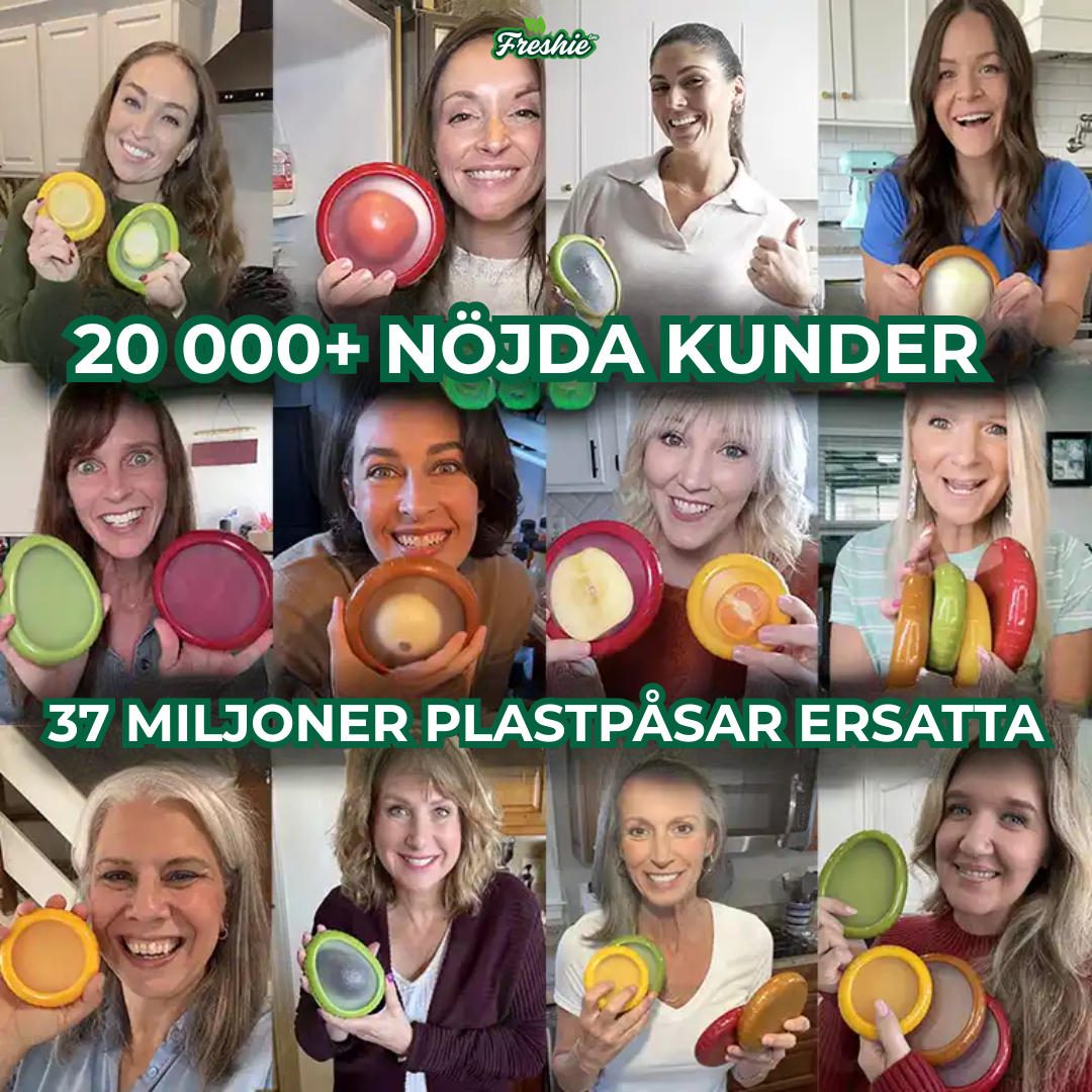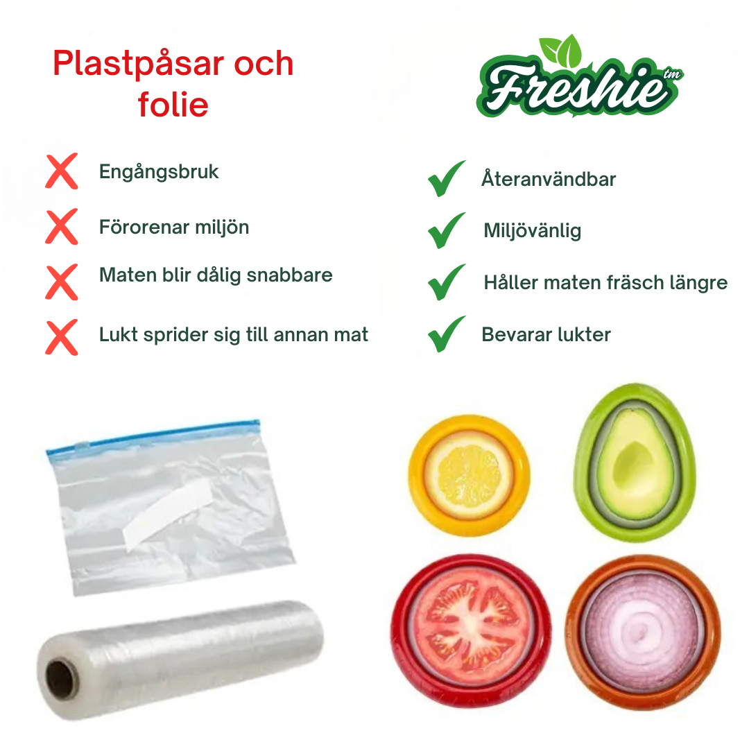 Freshie™ är smarta silikonskydd som håller frukt och grönsaker fräscha längre. De är töjbara, fria från BPA och sluter tätt utan att du behöver använda engångsplast.