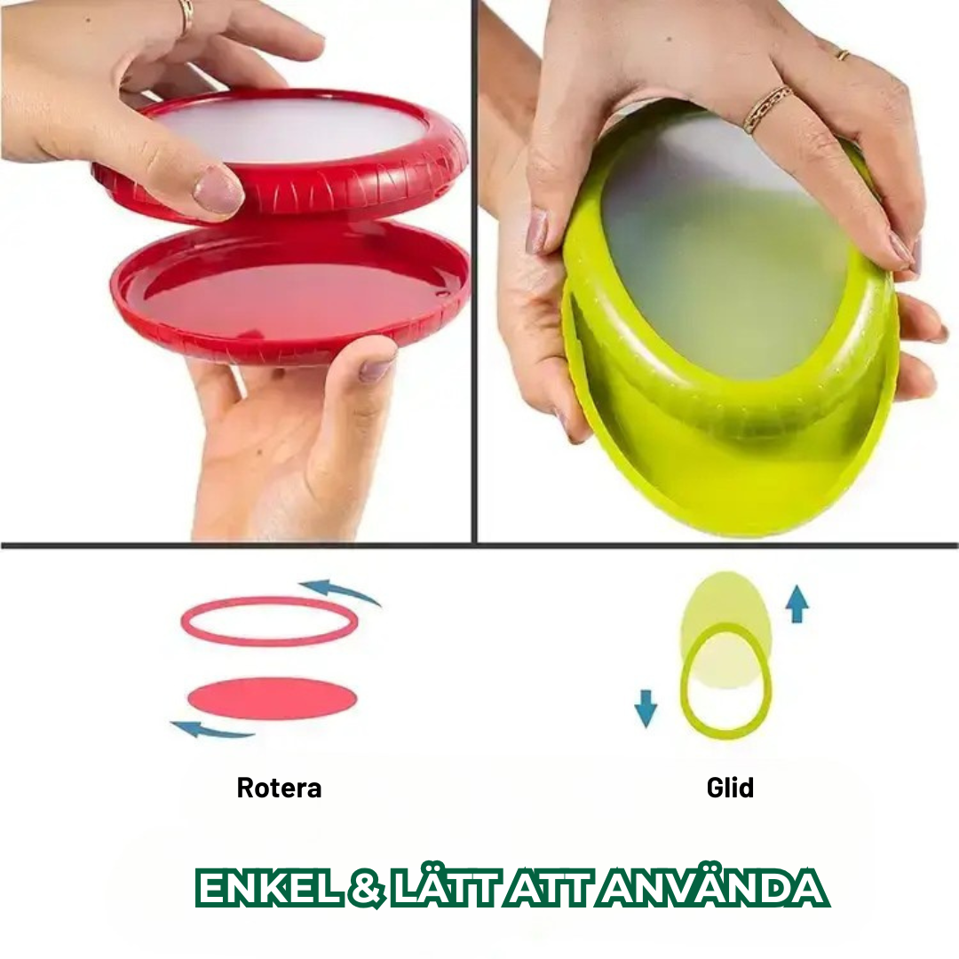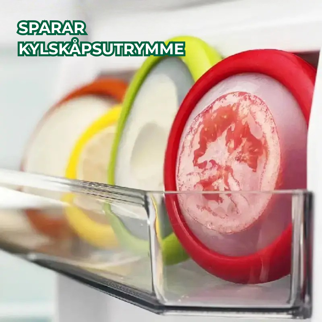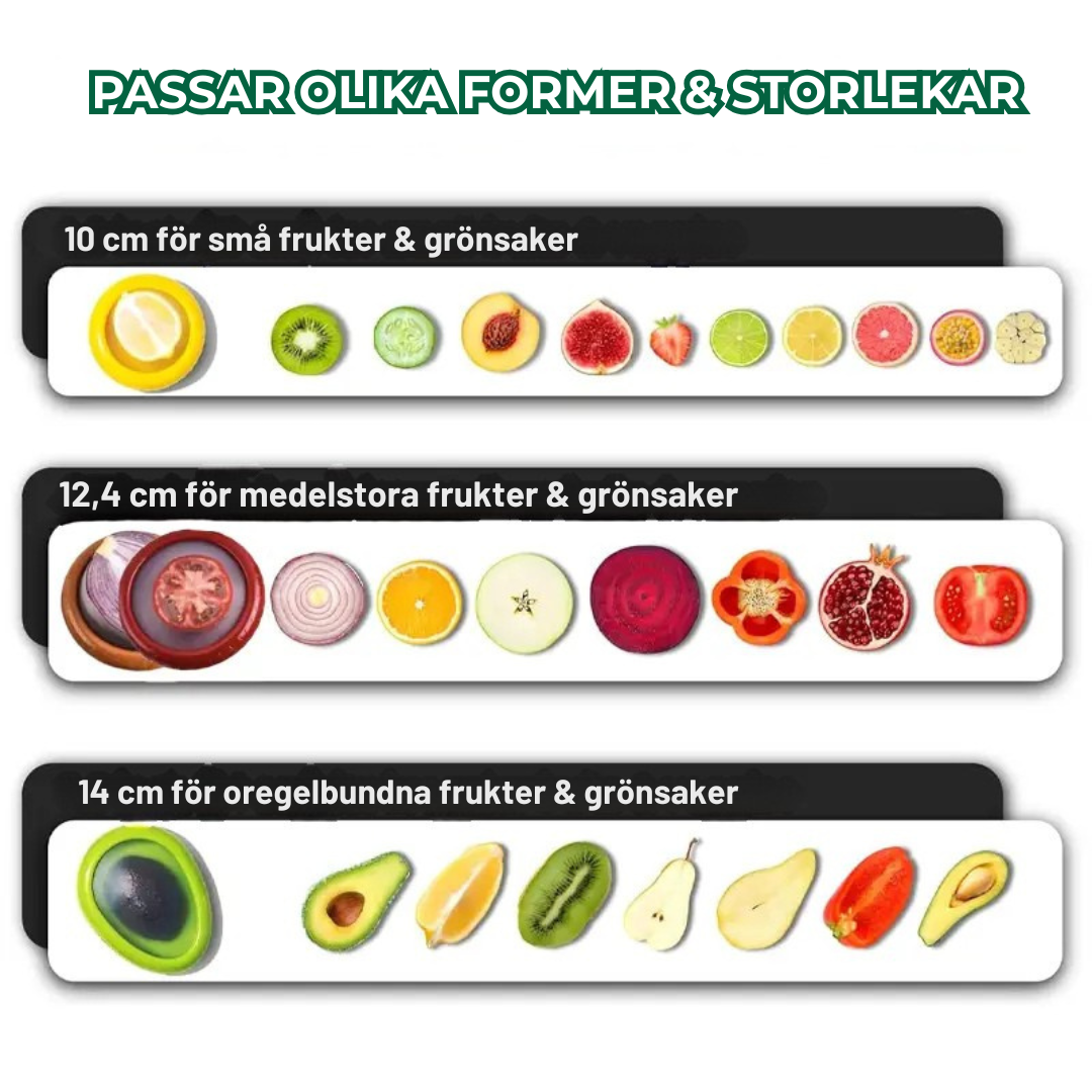 LUFTTÄT FÖRSEGLING FÖR LÅNGVARIG FÄRSKHET: Freshie™ har en avancerad silikondesign som sträcker sig och formar sig runt uppskurna frukter och grönsaker. Denna täta försegling låser in färskheten och eliminerar lukter, vilket håller dina produkter färskare längre och håller ditt kylskåp luktfritt!