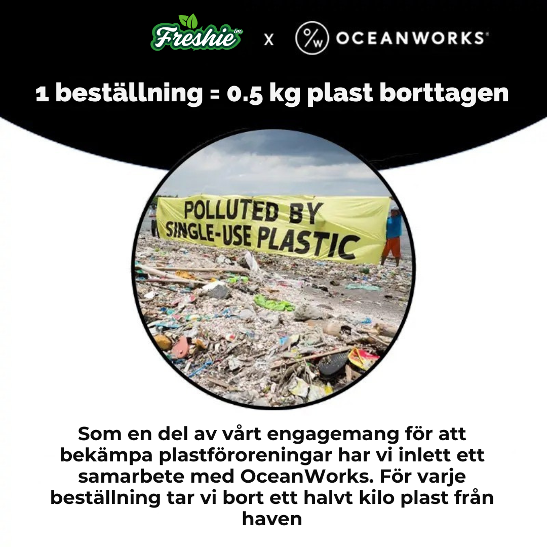 LÖSER FÖRORENINGSKRISEN: Medan Freshie™ förhindrar framtida plastavfall fortsätter befintlig förorening att skada våra hav... Över 100 miljoner djur i havet skadas årligen och mikroplaster finns till och med i vår mat nu! Därför har vi samarbetat med OceanWorks för att ta bort 0,5 kg havsplast för varje beställning - vi tacklar både morgondagens avfall och dagens kris.