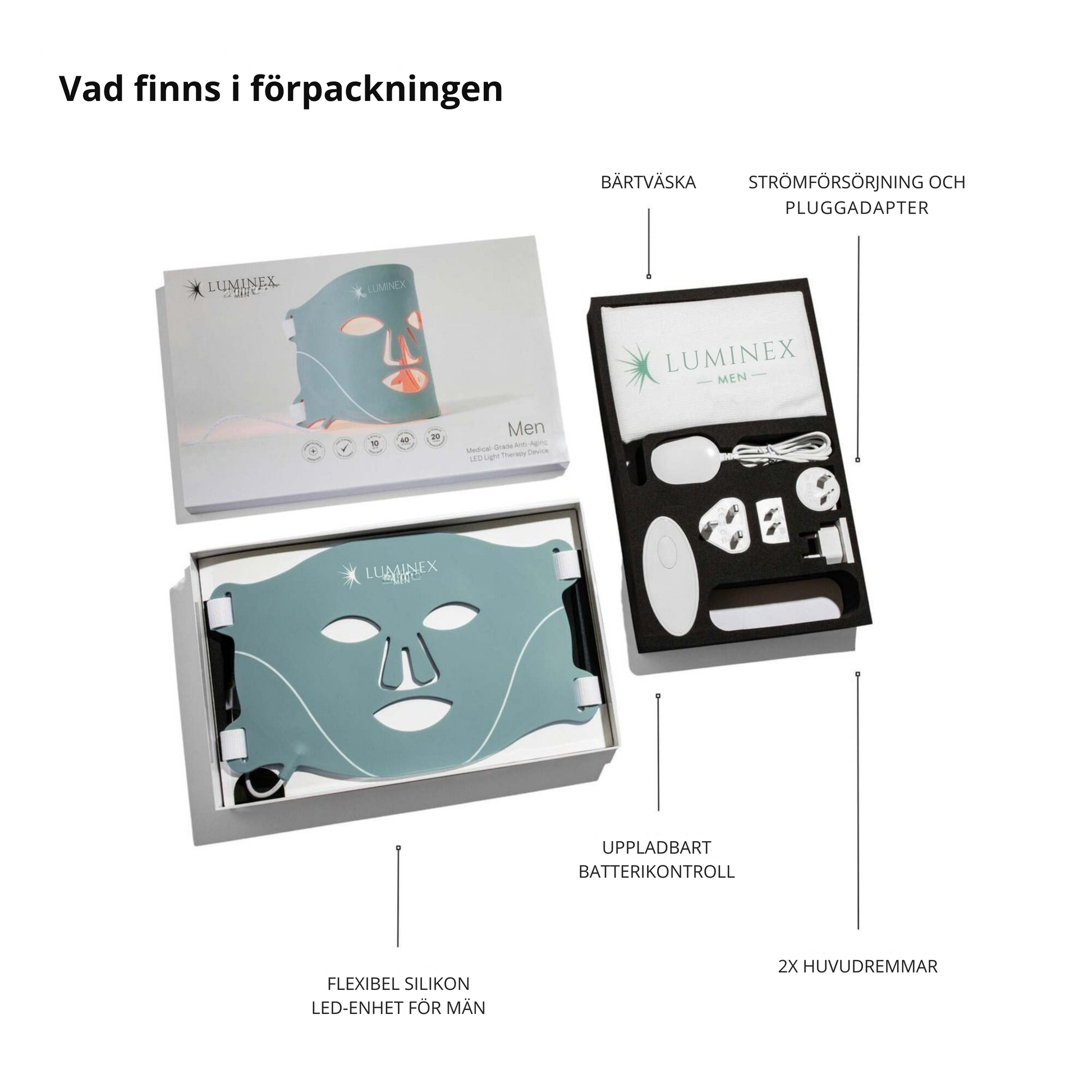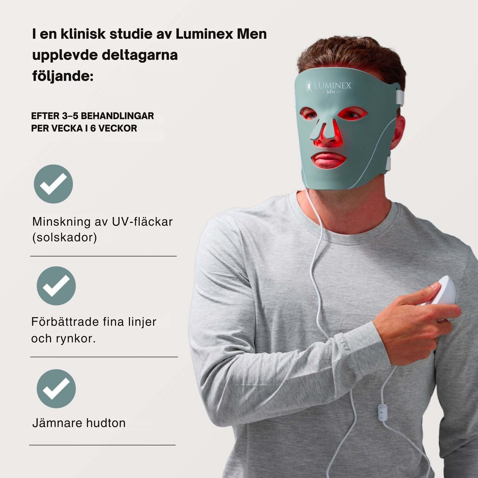 Luminex Men är den första LED-ljusterapimasken som utvecklats specifikt för mäns hud. Baserad på den världsledande ljusterapiteknologin från Luminex Medical, är Luminex Men en FDA-godkänd, flexibel, portabel och prisvärd enhet för hemmabruk som använder lysdioder (LED) för att minska fina linjer och rynkor samt förbättra den övergripande hudtonen, fastheten och hudhälsan.