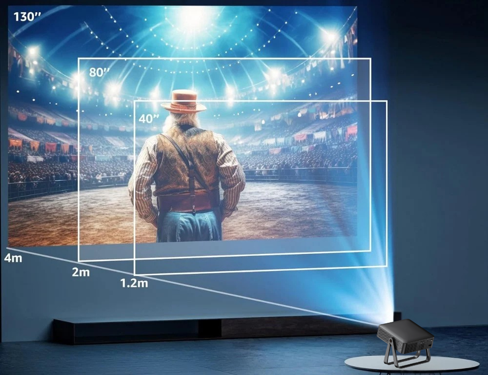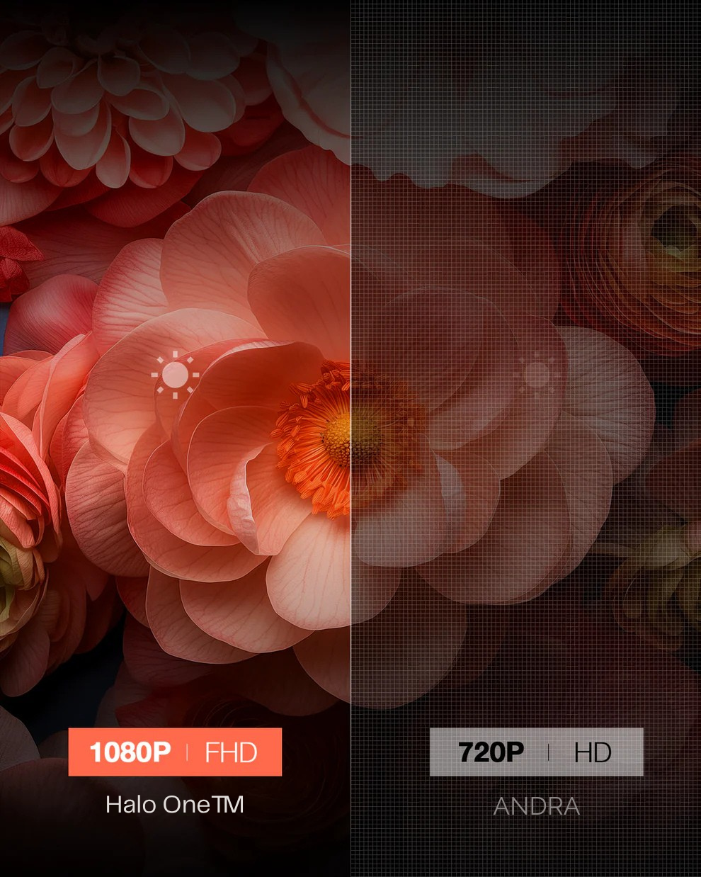 Upplev bilder i biokvalité med Halo One™. Dess 130-tumsskärm har en inbyggd upplösning på 1280*720P med stöd för 1080P, 2K och 4K UHD, vilket förvandlar vilket utrymme som helst till en livlig visningsarena, perfekt för filmer, serier eller sport.