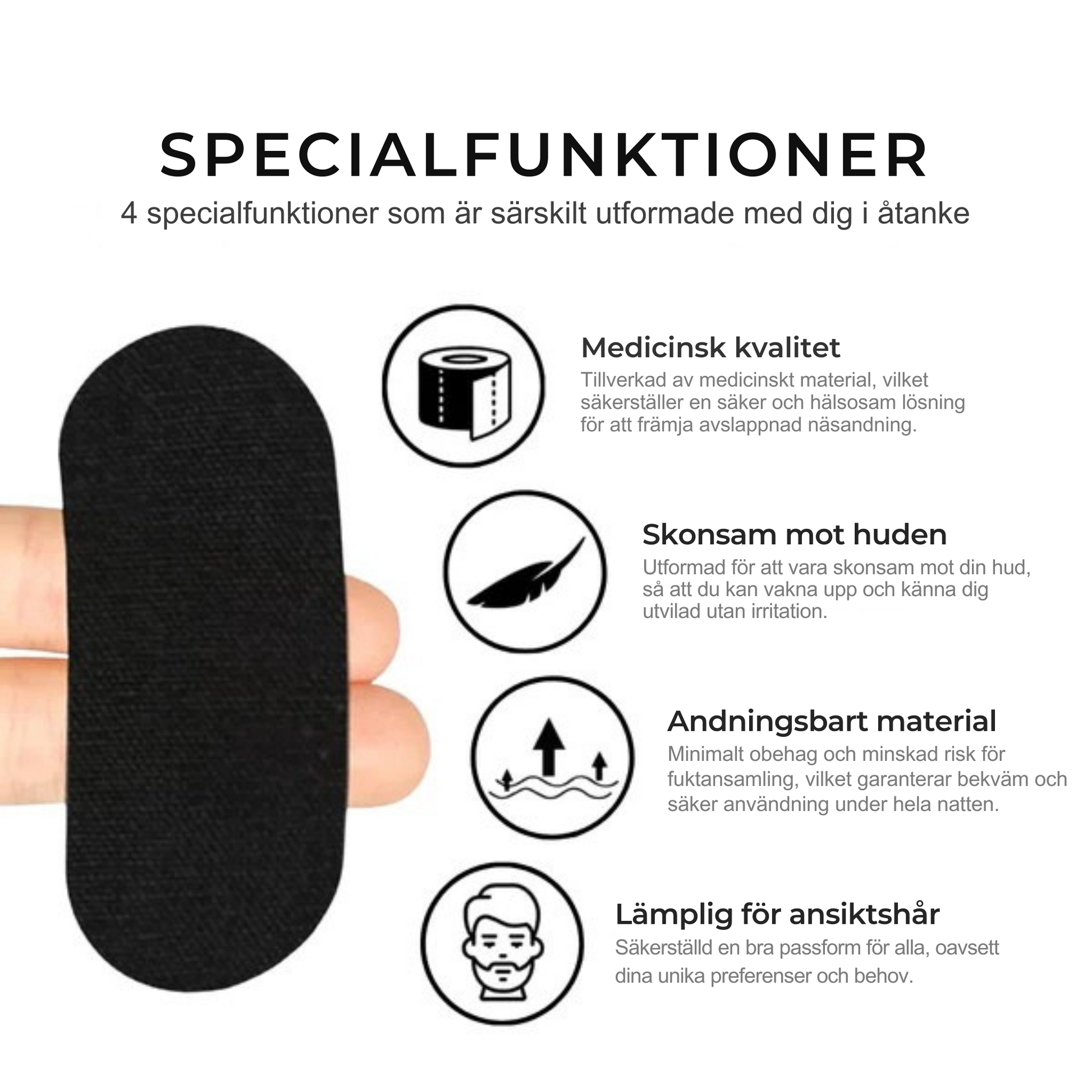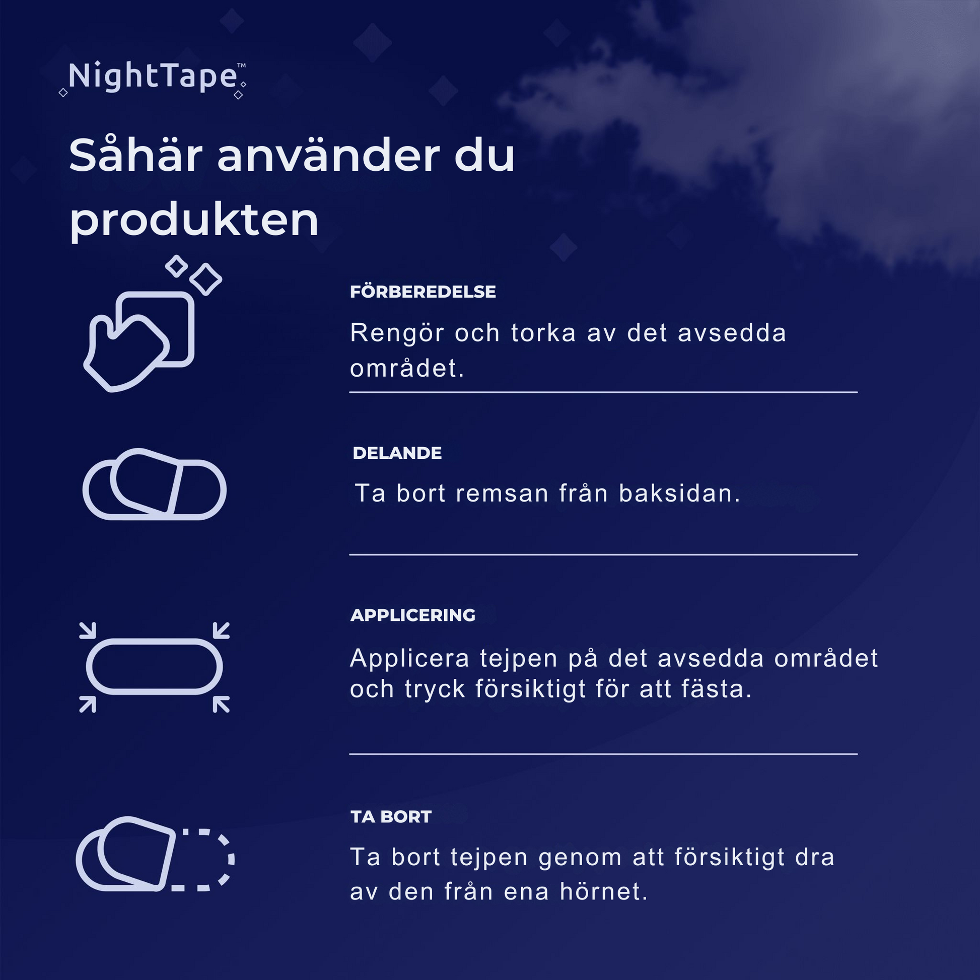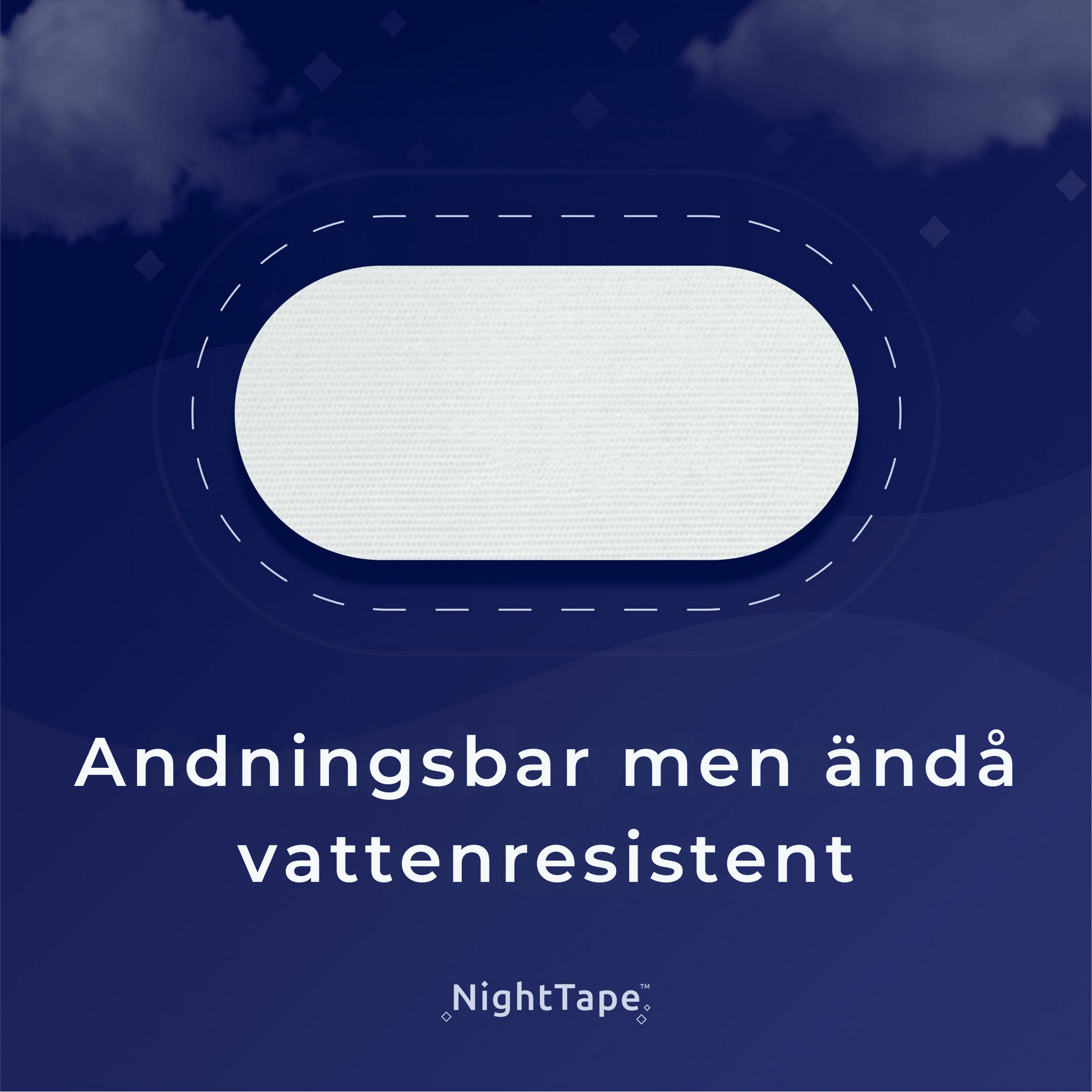 Låt inte snarkningar, torr mun eller dålig sömn hålla dig tillbaka. NightTape är den enkla men effektiva lösningen för att förbättra din andning, höja din sömnkvalitet och vakna upp utvilad varje morgon. Upplev effekten av att andas genom näsan och få djupare, ostörd vila - både för dig och din partner.