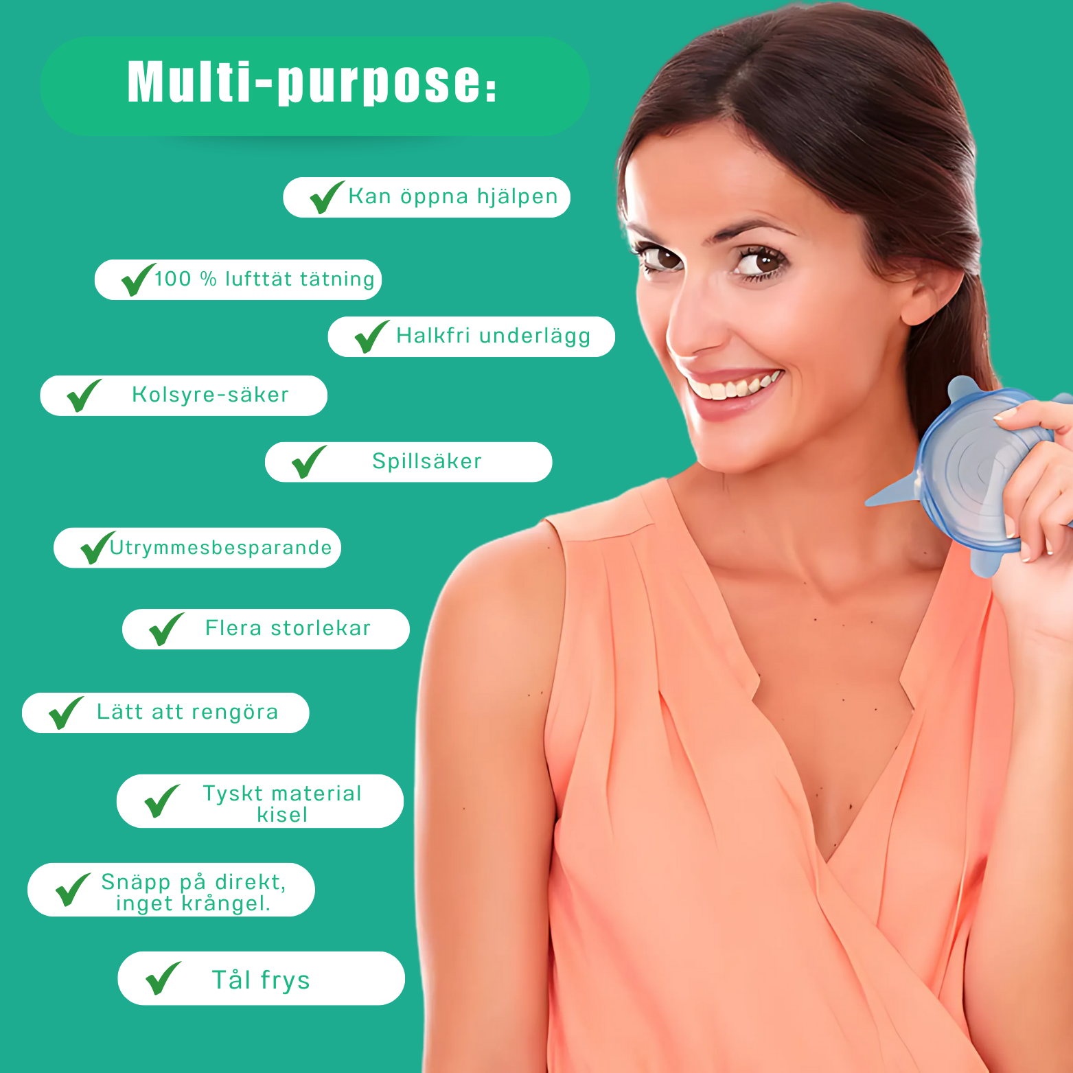 Dra det stretchbara locket över behållaren för att skapa en lufttät förslutning. Det flexibla silikonet anpassar sig efter alla former och håller maten färsk och säker.