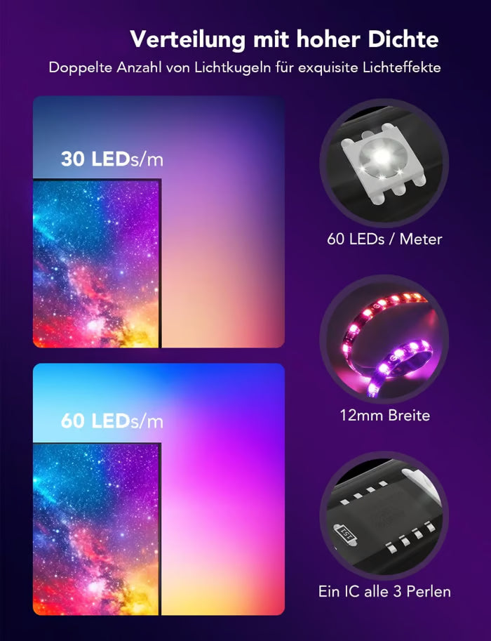 Färgfördelning med hög densitet: Njut av en tätare ljusfördelning med dubbelt så många ljuskällor för mer levande och naturliga ljuseffekter. Skapa ditt eget bioparadis och njut av tiden hemma.